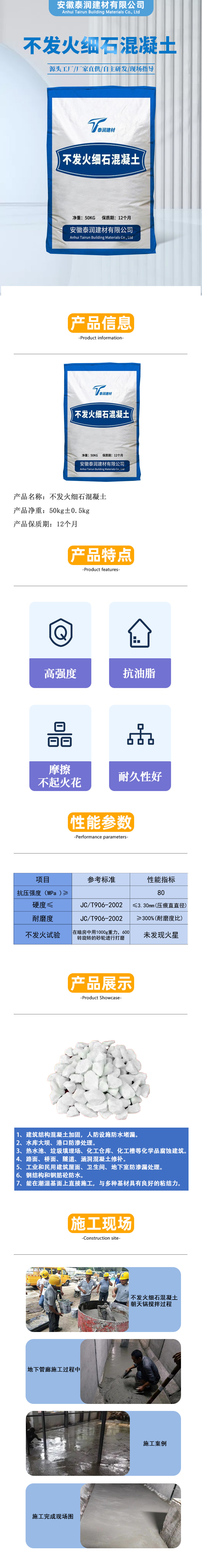 不發(fā)火細(xì)石混凝土,又稱防爆混凝土,是一種能經(jīng)受沖擊而不發(fā)生火花的功能性混凝土,當(dāng)金屬或堅(jiān)硬石塊等物體與該類混凝土發(fā)生摩擦沖擊等機(jī)械作用時(shí),均不發(fā)生紅灼火花或火星,從而易燃物質(zhì)不易引發(fā)火中爆炸危險(xiǎn),多用于油庫、化工廠等嚴(yán)禁火種或具有防火要求的建筑物。