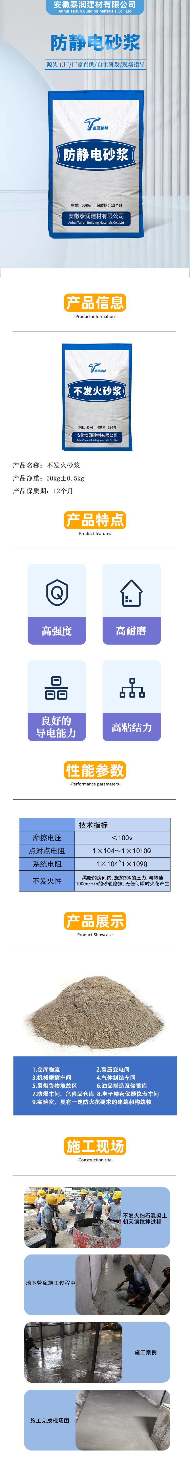 防靜電不發(fā)火砂漿是由耐磨骨料(珠光體可鍛鑄鐵和導電體)、水泥,及用于提高施工性能的外加劑混合而成的一種復合材料。該金屬骨料和導電體是嚴格級配并不含雜質(zhì)。這些成份具有較高的導電能力和耐磨特點。